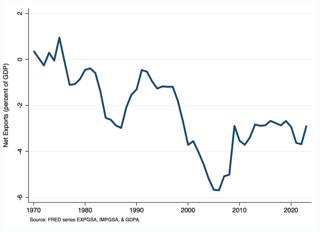 Often, we refer to net exports () as the nation’s trade balance of goods and services. We refer to a positive trade balance as a trade surplus, and we refer to a negative trade balance as a trade deficit. In the context of Figure 2, at any moment in time, the trade balance (as a share of GDP) is simply the vertical distance of the gap between the blue and red lines; a trade deficit [surplus] occurs when a point on the blue line is lower [higher] than a point on the red line. In Figure 3, I illustrate the United States trade balance as a share of GDP; the rightmost data point (for the year 2023) is -2.9 percent, which equals the difference between the rightmost data point for exports (11 percent) illustrated in Figure 2 minus the rightmost data point for imports (13.9 percent) illustrated in Figure 2.