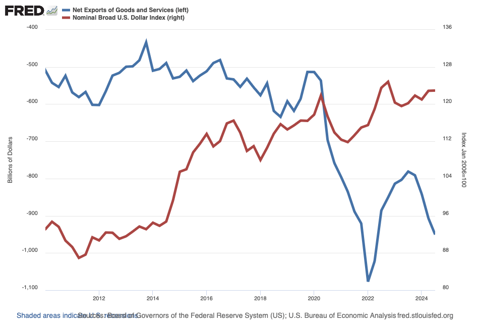 Put differently, in the case of a U.S. trade deficit, the international market for goods and services—think, the market for goods and services traded between the U.S. and the rest of the world—clears because the (negative) difference between national saving and domestic investment in the U.S. is matched by a positive difference between saving and investment in the rest of the world. The match—or equilibrium—occurs thanks to the foreign-exchange value of the U.S. dollar, which, in the case of a U.S. trade deficit, rises to clear the market.