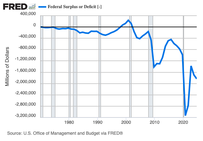 According to Figure 3, in which I illustrate the federal budget deficit in levels, as of the fourth quarter of 2024, a deficit of 6 percent of GDP translated to a deficit of $1.8 trillion.