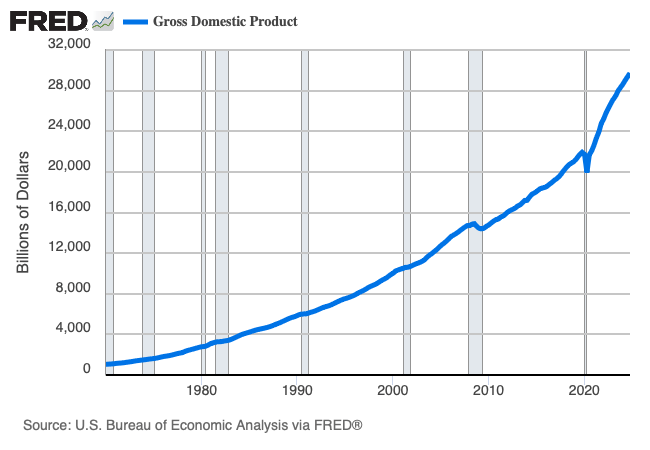 According to Figure 1, as of the fourth quarter of 2024, the U.S. economy, measured by nominal GDP, produced goods and services totaling a market value of $30 trillion—as in $30 million, one million times!
