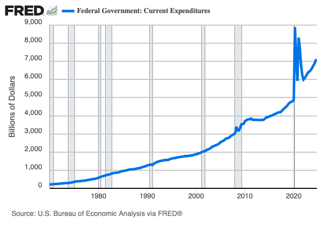 Decreasing federal government expenditures is understandably front of mind these days, in large part because the federal budget deficit, which we think about as the (negative) difference between government revenues and government expenditures, is big—again, like, really big: for fiscal year 2024, roughly 6 percent of GDP, but what does that mean…in levels?