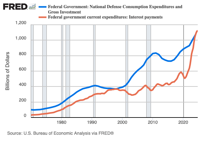 According to Figure 4, as of the fourth quarter of 2024, total federal debt outstanding registered $36 trillion—as in $36 million, one million times. Incidentally, all else equal, the debt grows in part because the U.S. Treasury must pay interest on the debt. According to Table 1, in fiscal year 2024, net interest registered $881 billion, nearly a trillion dollars, about half the level of the federal budget deficit, and more than defense discretionary spending ($850 billion; Figure 5).